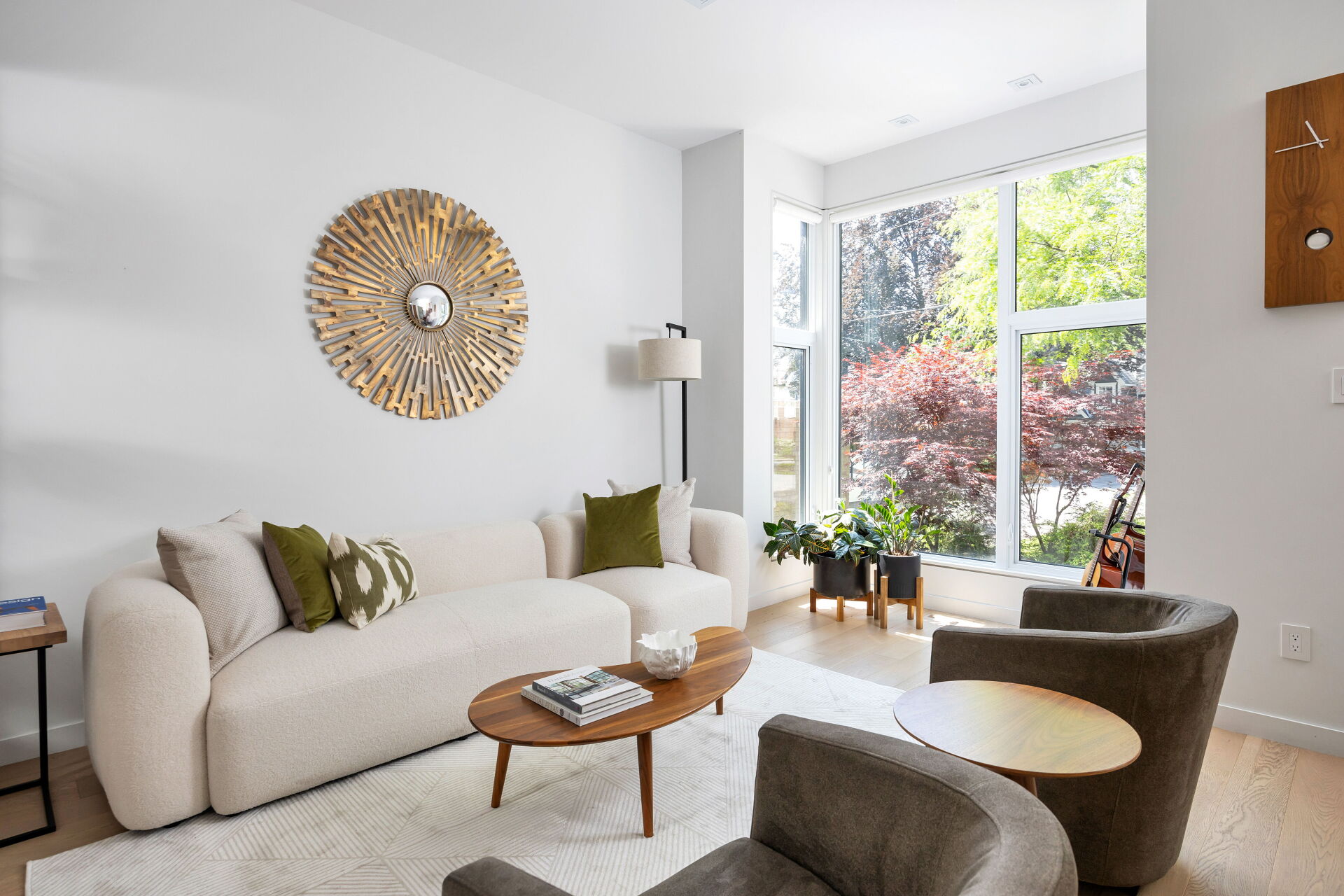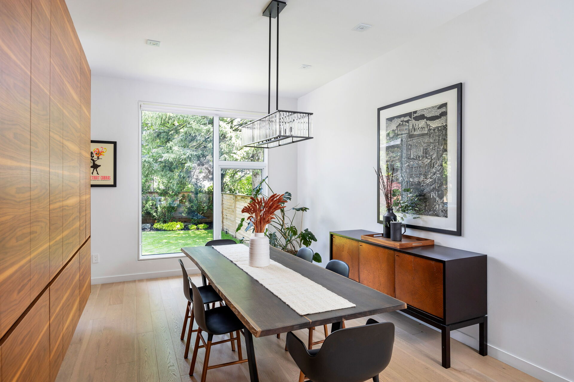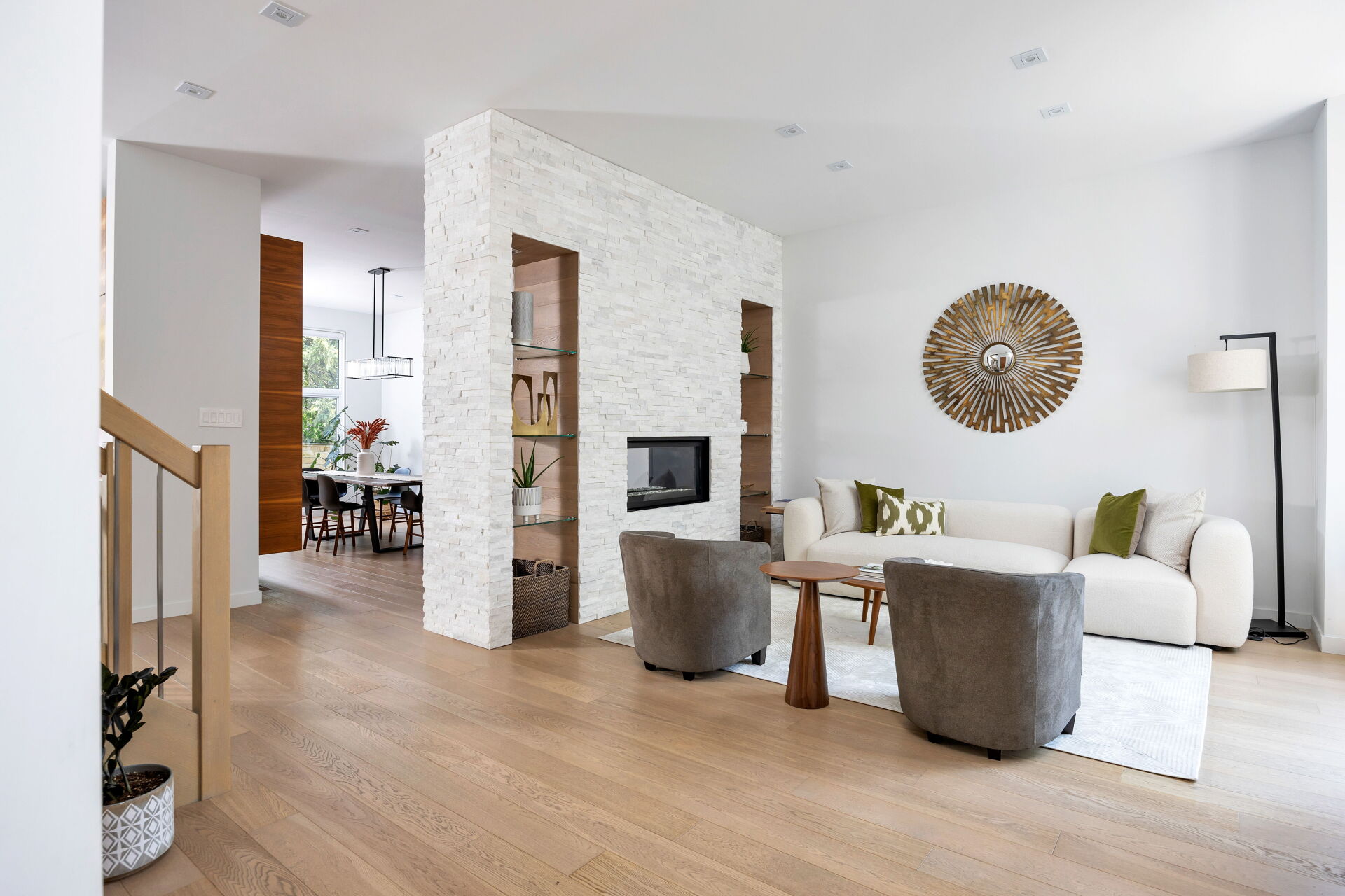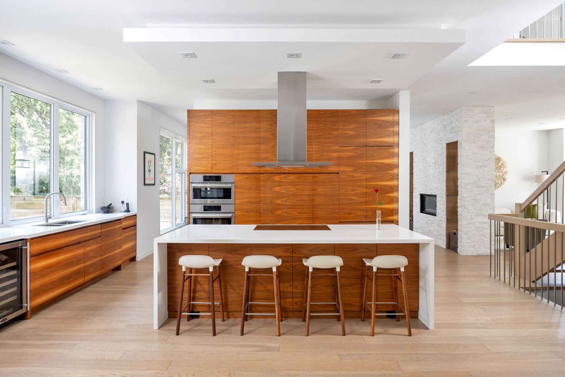 Every square inch of this spacious home is useable for quiet retreat & leisure while merging the highest quality workmanship with clever design — the home’s main level features soaring 10-foot ceilings, oversized floor-to-ceiling windows that flood the space with natural light, white oak hardwood floors, solid wood doors, dramatic fireplaces, and premium custom built-in walnut finishes throughout.