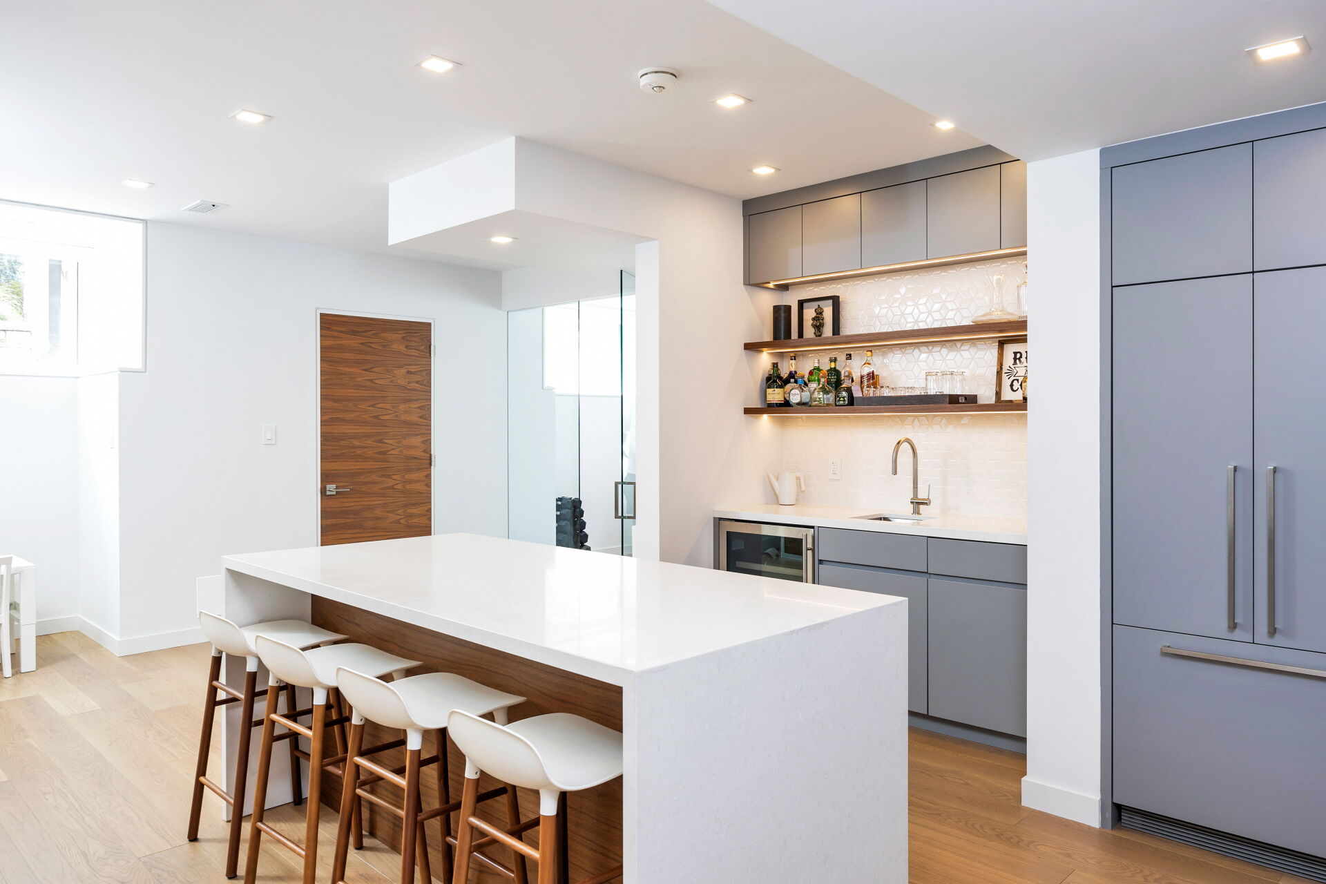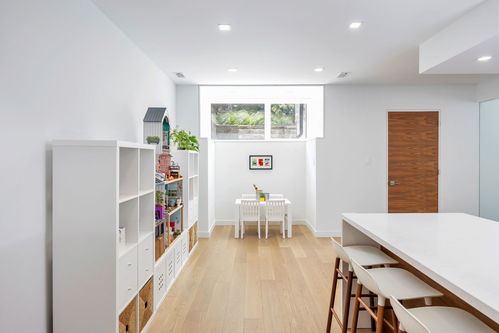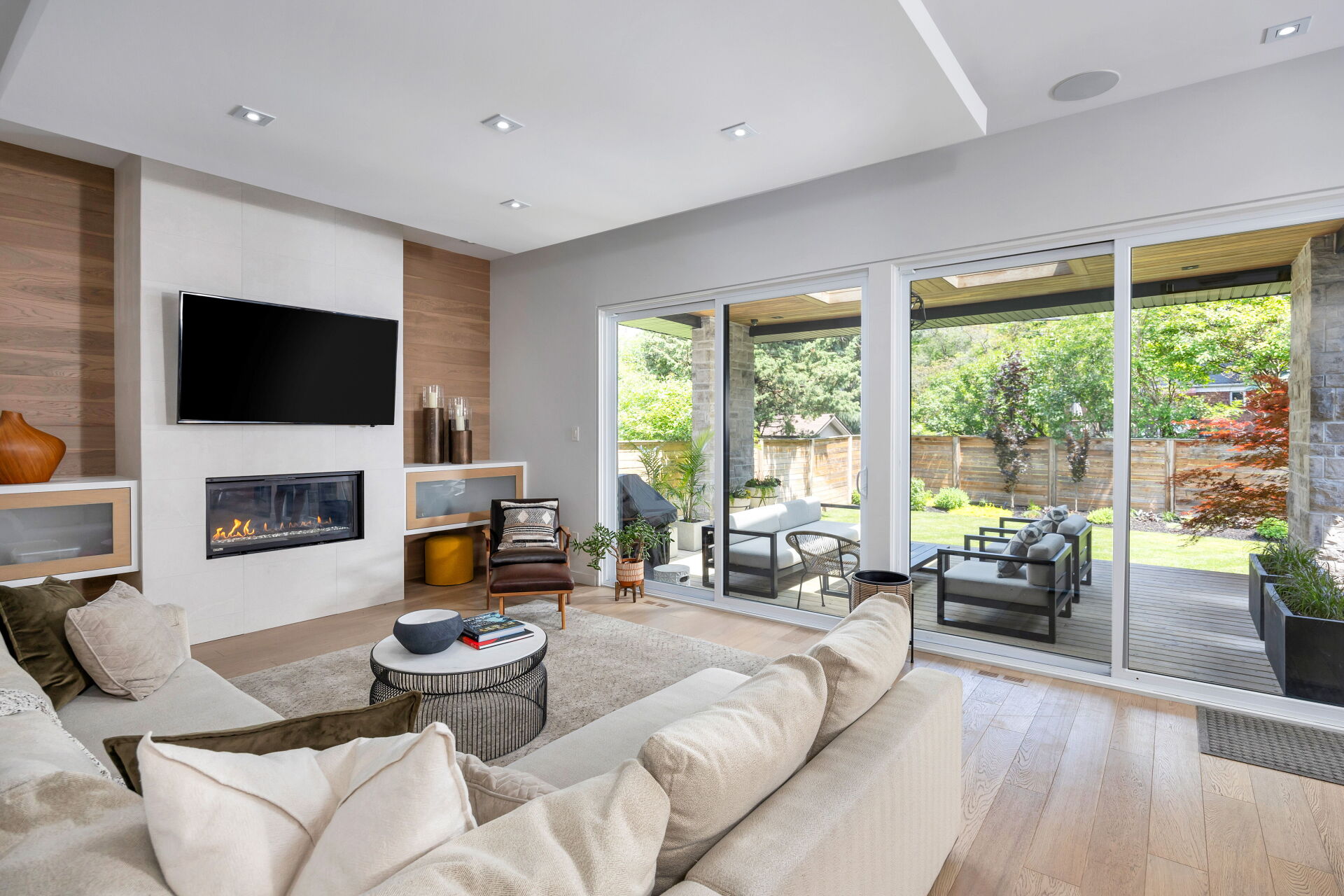 The family area features built-in cabinetry that flanks the dramatic floor-to-ceiling gas fireplace framed with concrete-inspired cladding. Walk through the family area to an oversized and covered deck, which provides a perfect backdrop in which to delight friends, dine al fresco, or simply enjoy a cocktail at the end of the day. The wall-to-wall, floor-to-ceiling windows offer a seamless transition from indoor to outdoor space.