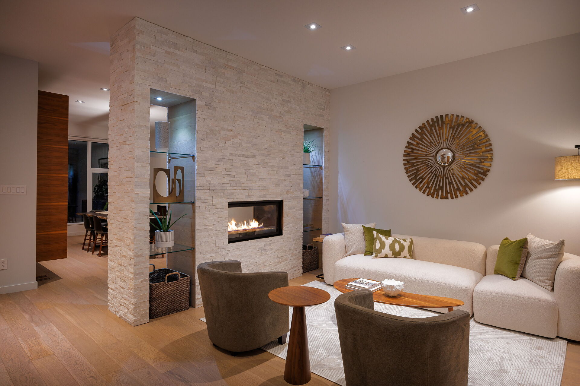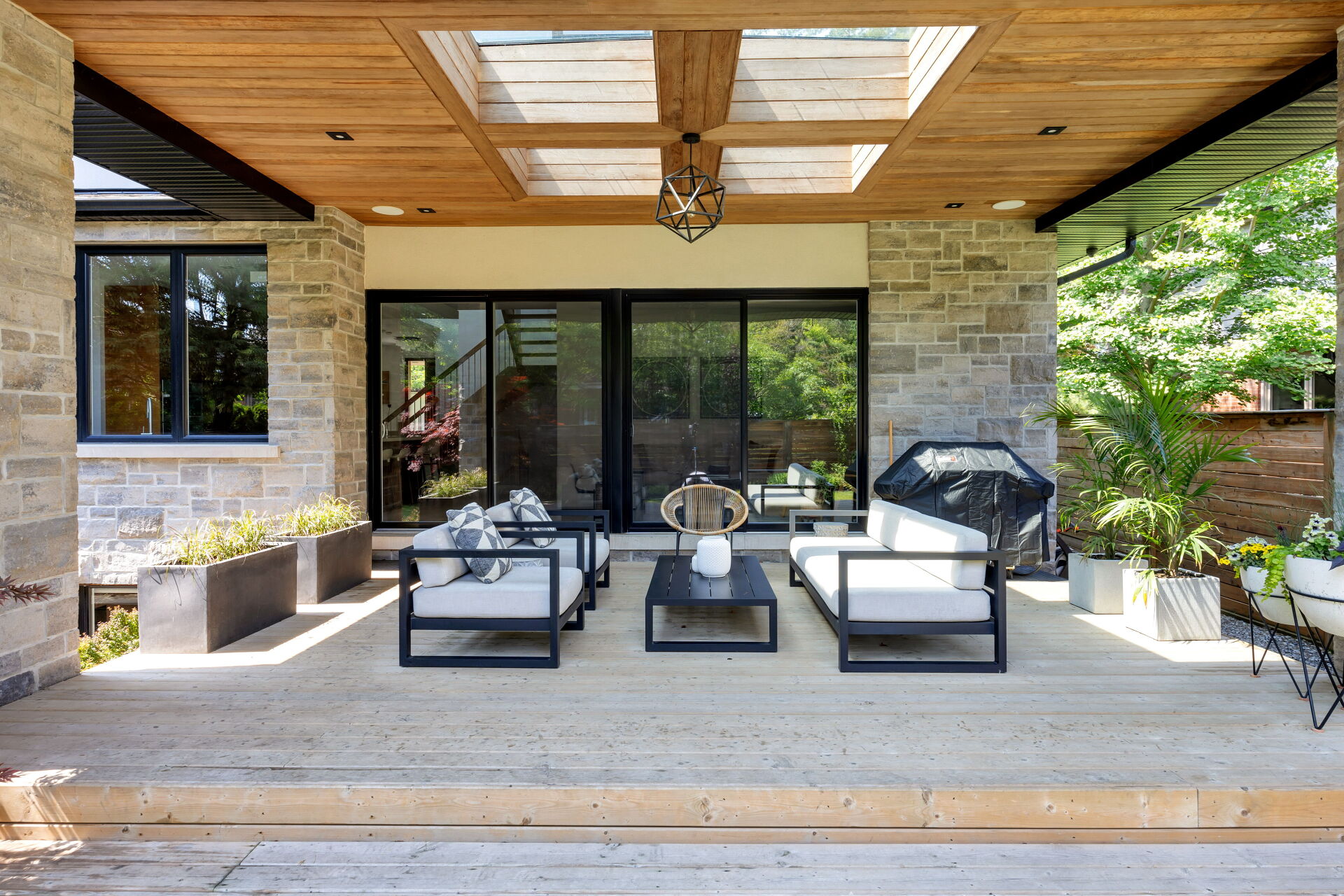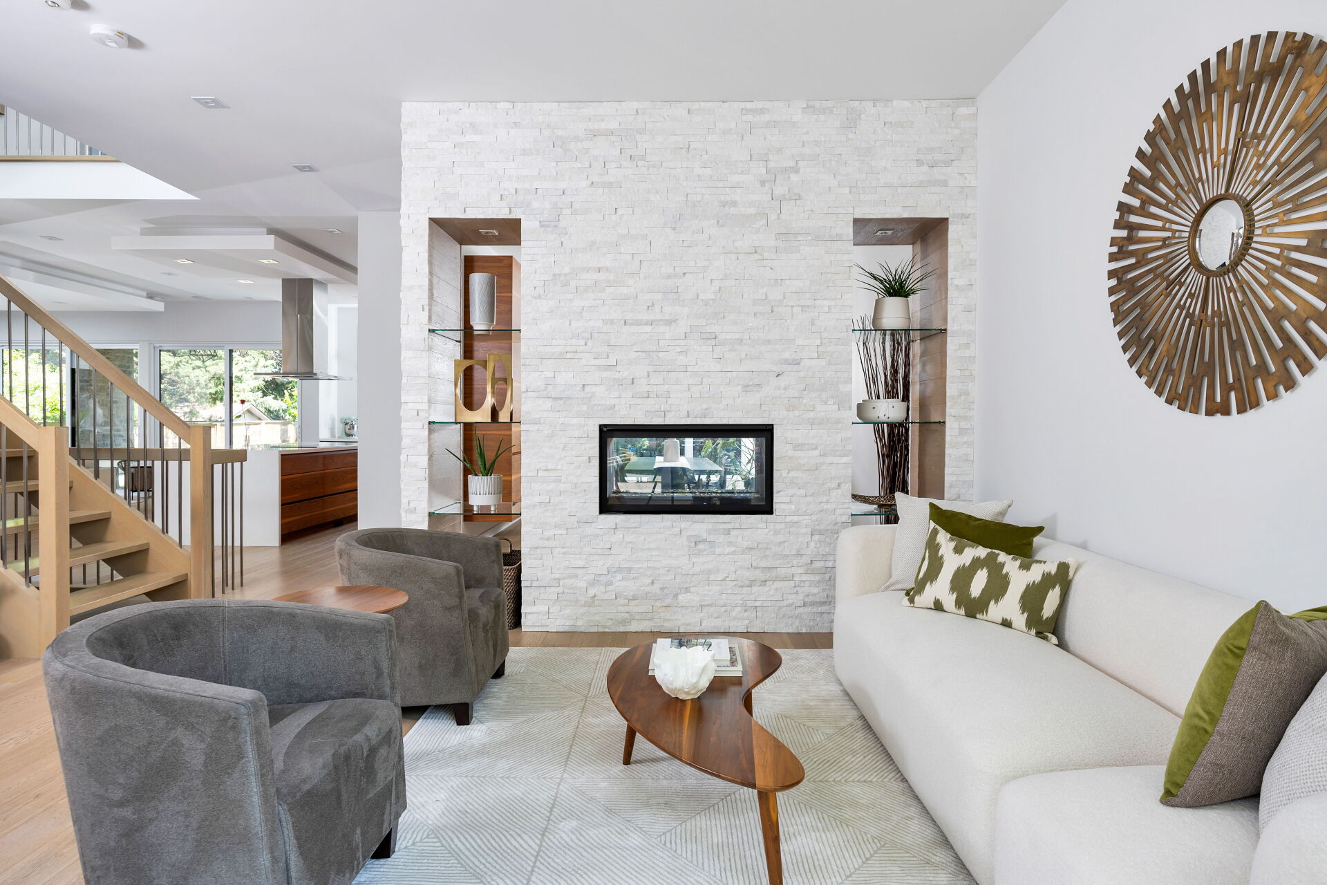 The family area features built-in cabinetry that flanks the dramatic floor-to-ceiling gas fireplace framed with concrete-inspired cladding. Walk through the family area to an oversized and covered deck, which provides a perfect backdrop in which to delight friends, dine al fresco, or simply enjoy a cocktail at the end of the day. The wall-to-wall, floor-to-ceiling windows offer a seamless transition from indoor to outdoor space.