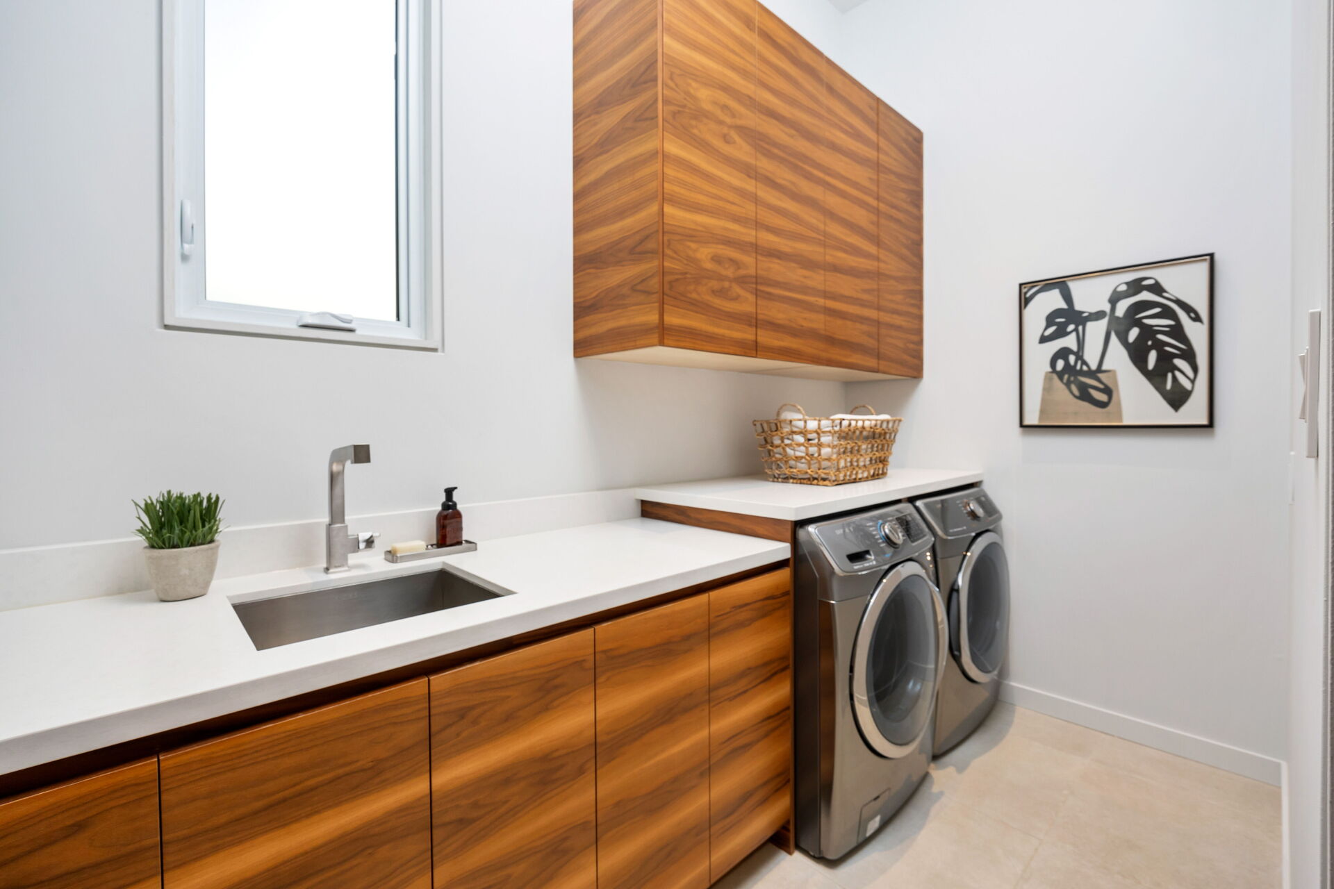 The main floor houses a perfectly designed mudroom with wall-to wall, built-in walnut cabinetry, an inviting laundry area, as well as a convenient powder room.