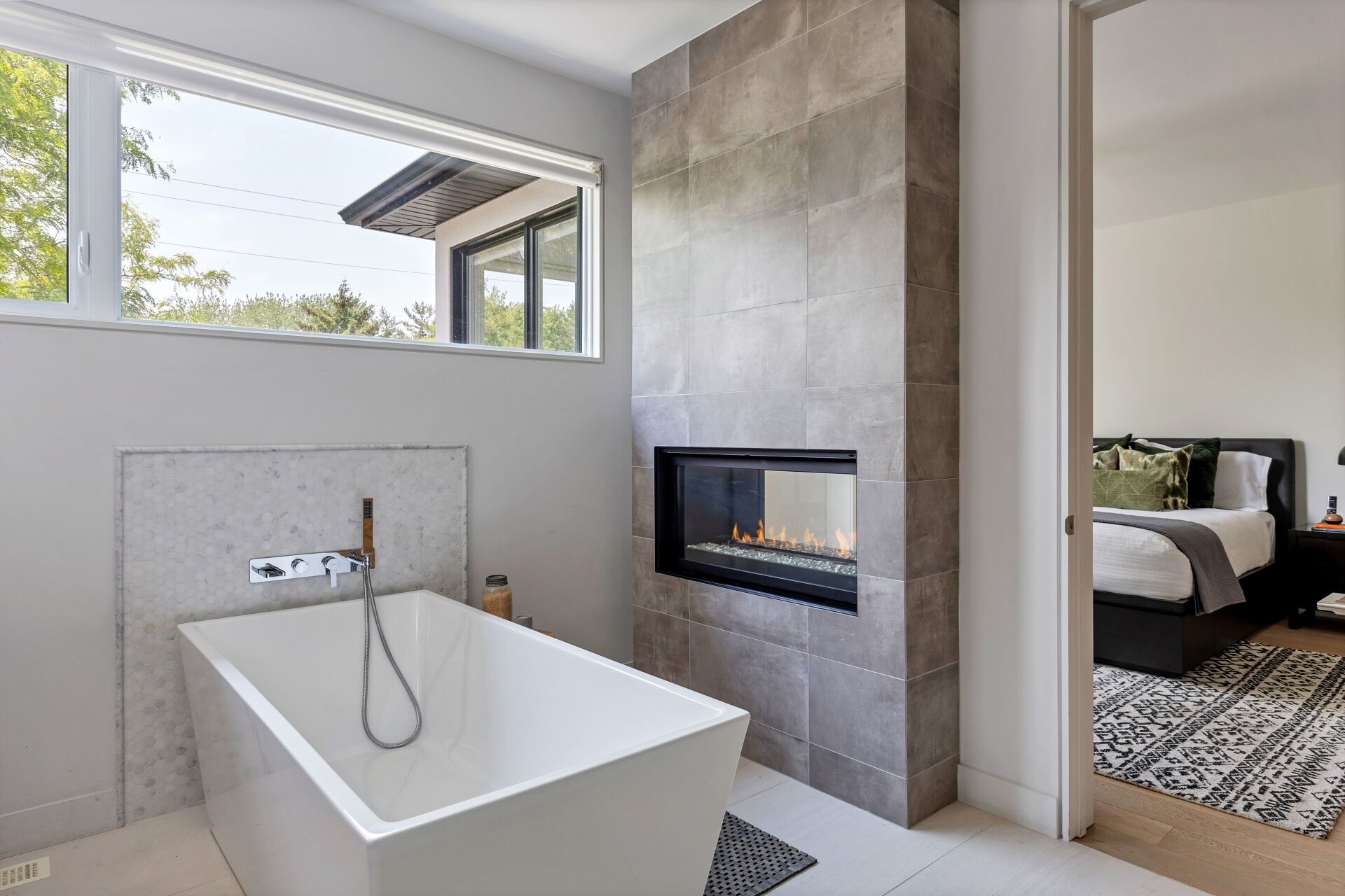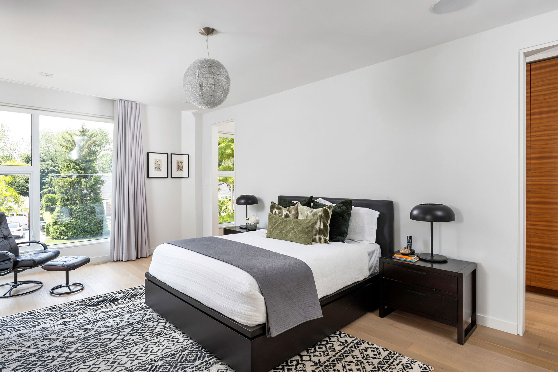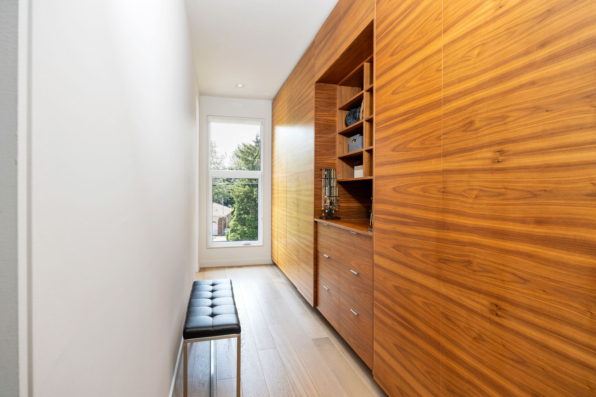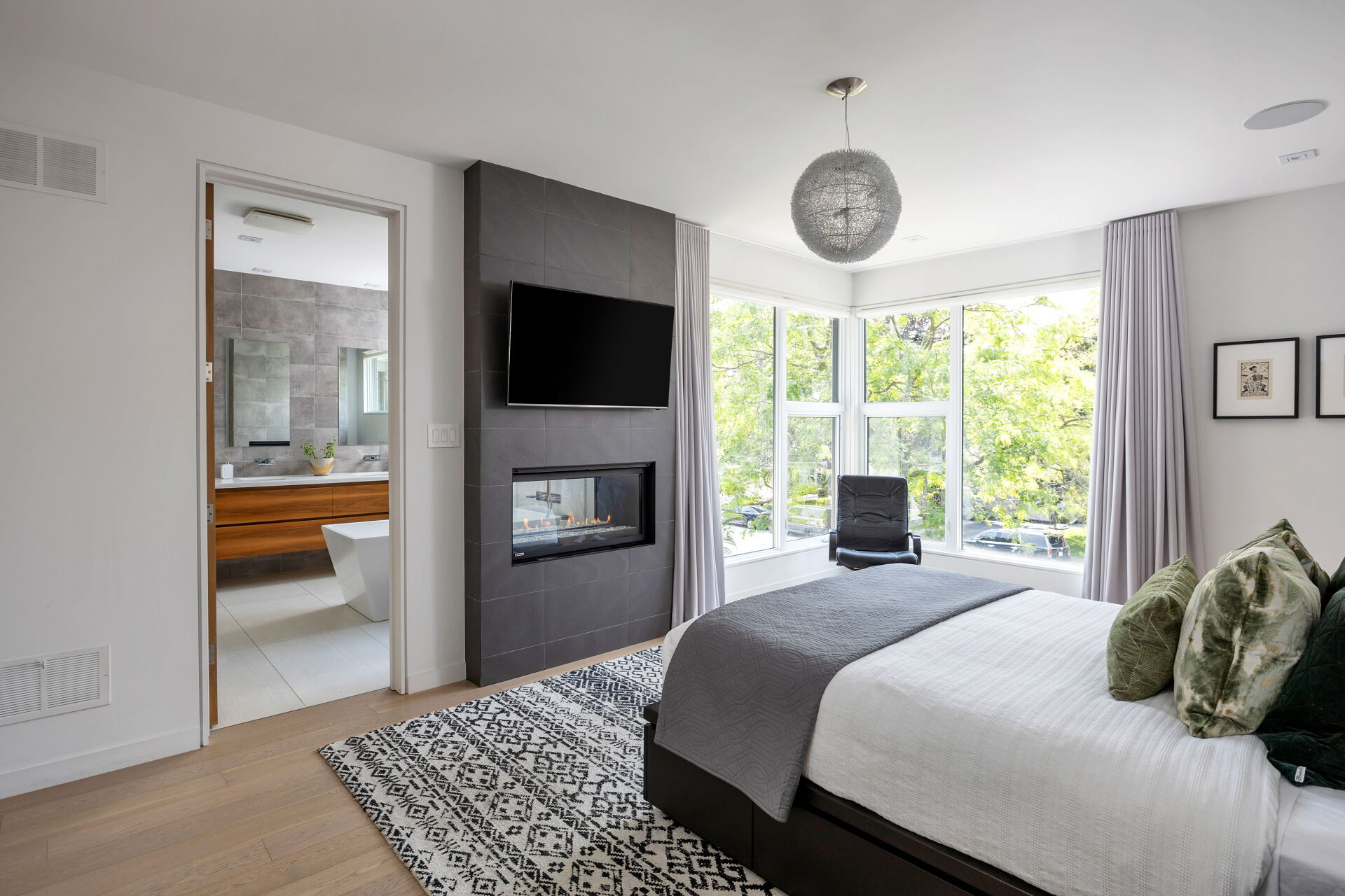 The home’s second level features four spacious and beautifully appointed bedrooms, and three serene, spa-inspired bathrooms. The spacious primary bedroom features a dramatic double-sided gas fireplace, creating a calm, focused space in which to start, or end, the day. The primary bedroom also features a five-piece ensuite with double sinks and quartz vanities, a standalone soaker tub, and an oversized glass walk-in shower. The primary bedroom also has the perfect walk-in wardrobe room with floor-to-ceiling, wall-to-wall, his-and-hers, custom walnut cabinetry. Retreat downstairs to the lower level, featuring wide windows for natural light, in-floor heating and white oak hardwood flooring throughout. The lower level includes a spacious media room with custom built-in walnut cabinetry, built-in speakers, and a designer gas fireplace. Also included is a well-proportioned bedroom with an adjacent 3-piece bathroom. Another unique feature is a sound-treated music studio — perfect for honing the kids’ skills after music lessons. The glass-walled gym provides a perfect backdrop in which to be invigorated. After a workout, or at the end of a busy day, unwind by the adjacent wet bar with family and friends.