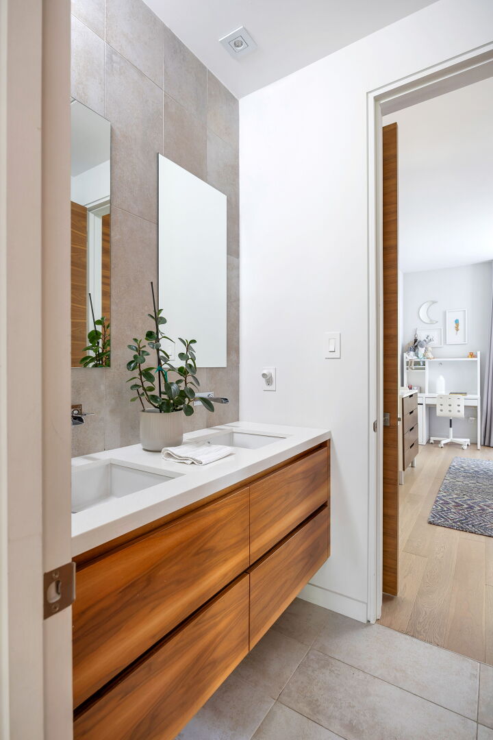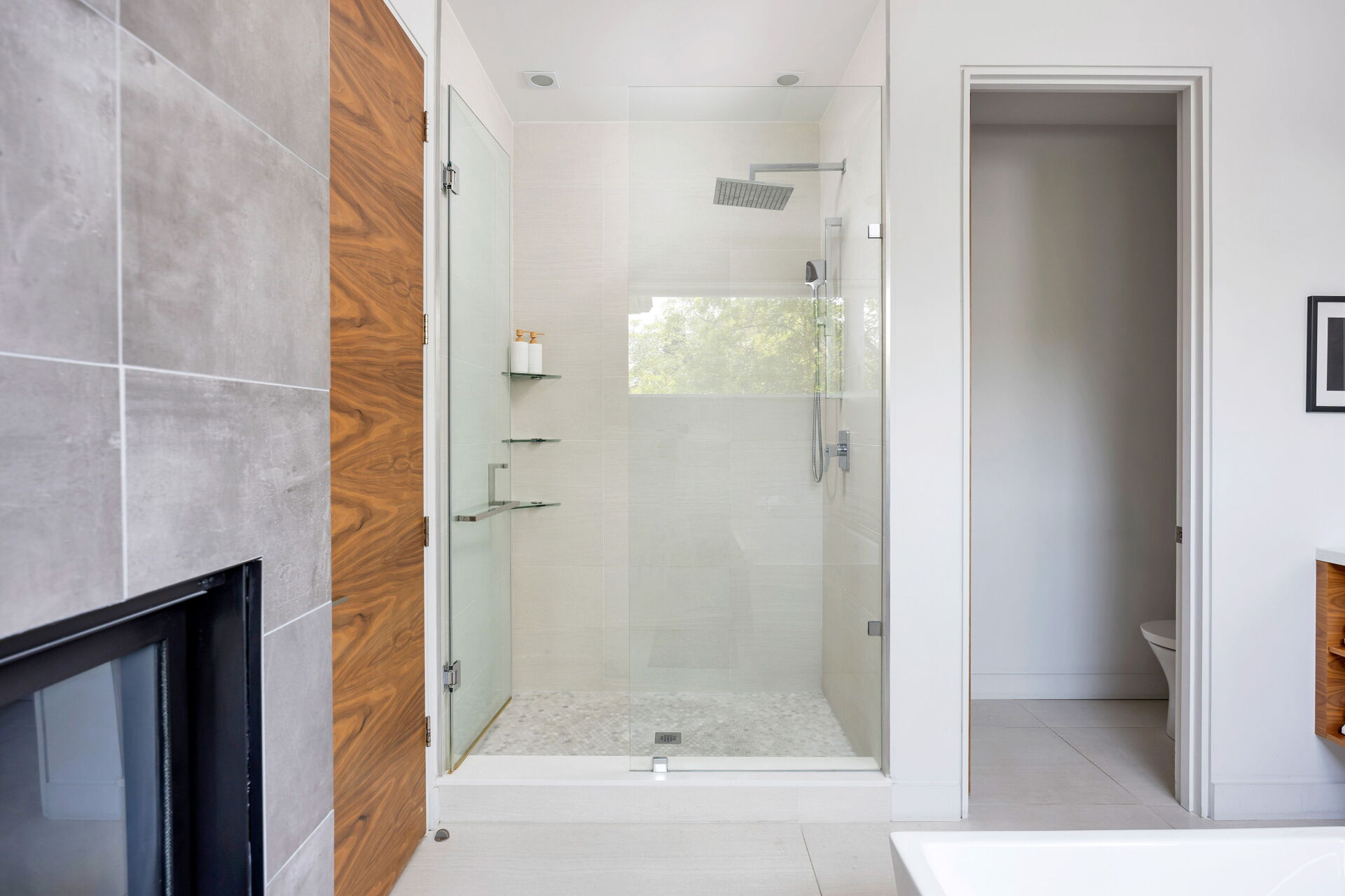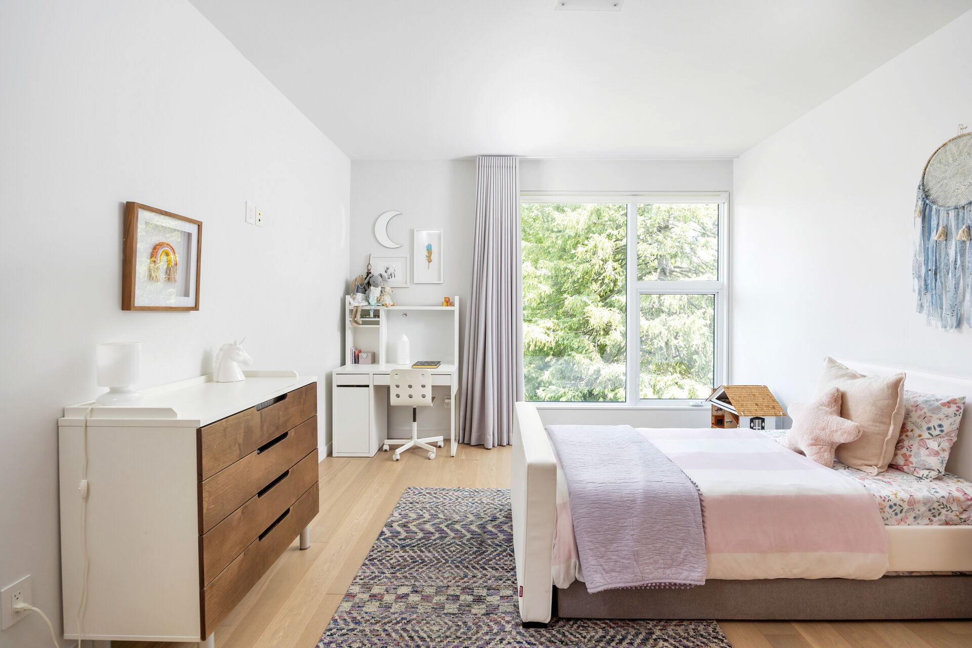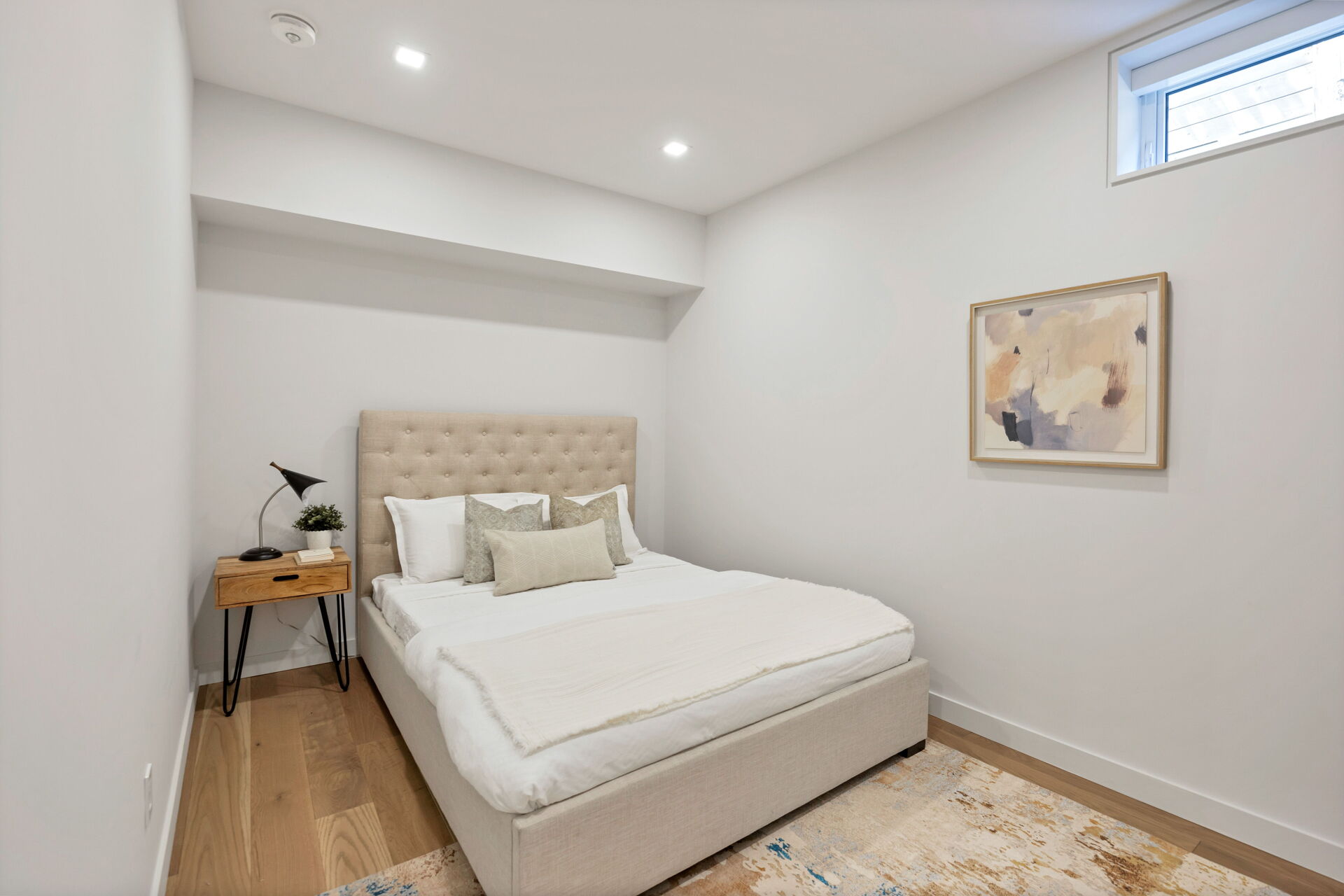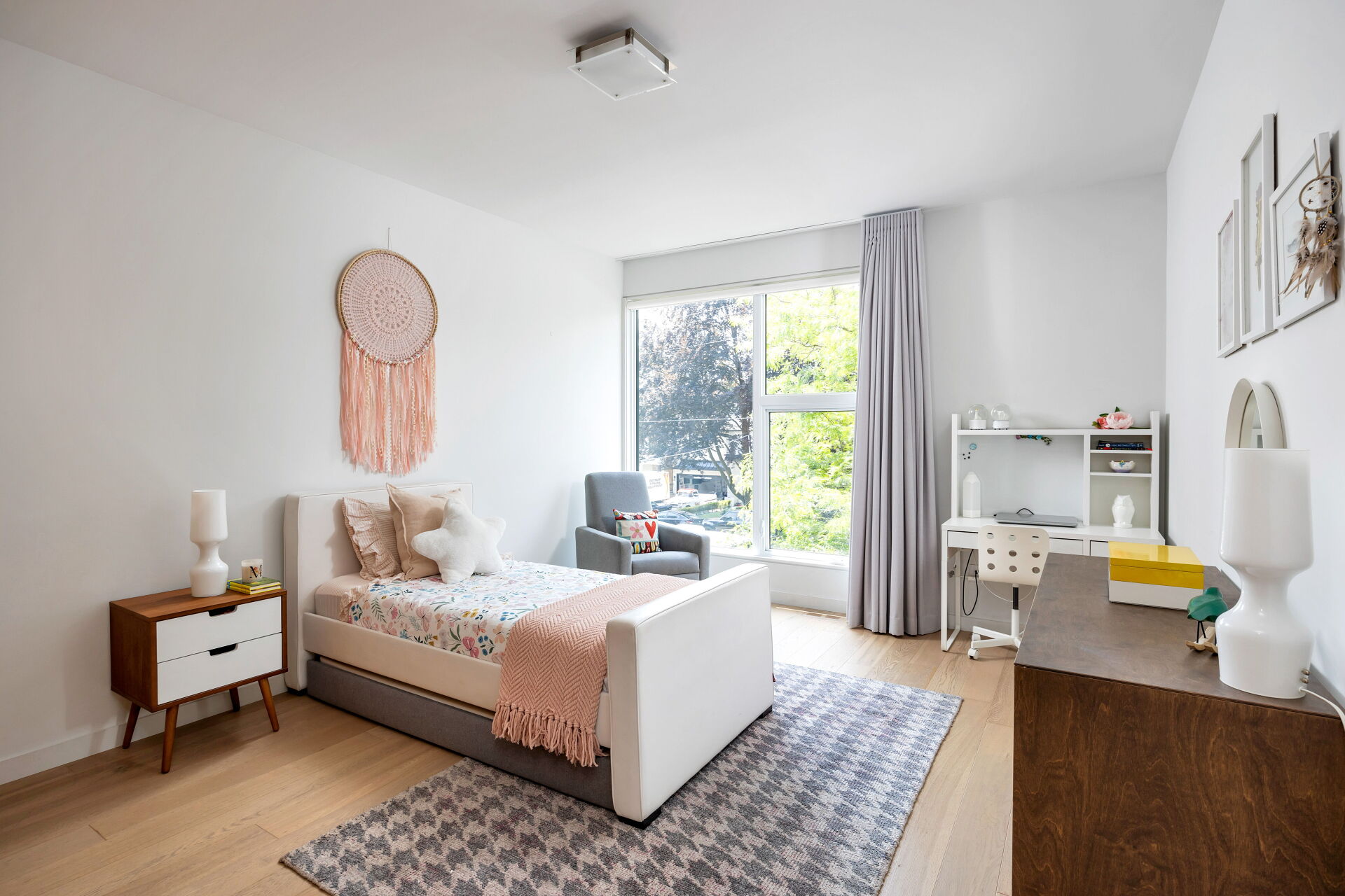 The home’s second level features four spacious and beautifully appointed bedrooms, and three serene, spa-inspired bathrooms. The spacious primary bedroom features a dramatic double-sided gas fireplace, creating a calm, focused space in which to start, or end, the day. The primary bedroom also features a five-piece ensuite with double sinks and quartz vanities, a standalone soaker tub, and an oversized glass walk-in shower. The primary bedroom also has the perfect walk-in wardrobe room with floor-to-ceiling, wall-to-wall, his-and-hers, custom walnut cabinetry. Retreat downstairs to the lower level, featuring wide windows for natural light, in-floor heating and white oak hardwood flooring throughout. The lower level includes a spacious media room with custom built-in walnut cabinetry, built-in speakers, and a designer gas fireplace. Also included is a well-proportioned bedroom with an adjacent 3-piece bathroom. Another unique feature is a sound-treated music studio — perfect for honing the kids’ skills after music lessons. The glass-walled gym provides a perfect backdrop in which to be invigorated. After a workout, or at the end of a busy day, unwind by the adjacent wet bar with family and friends.